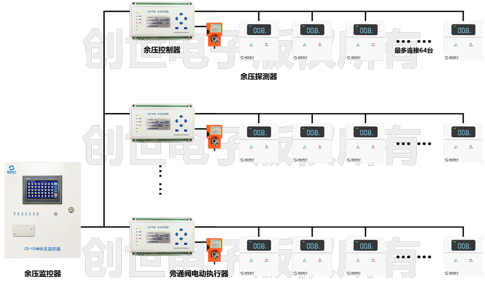 一台余压监控器可以控制256台余压控制器,一台余压控制器可以联动一个泄压阀,64台余压传感器
